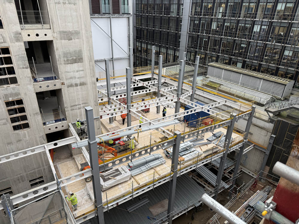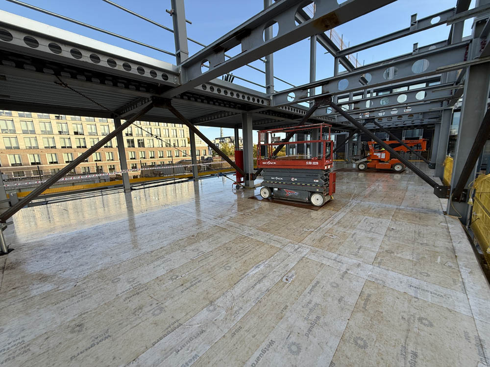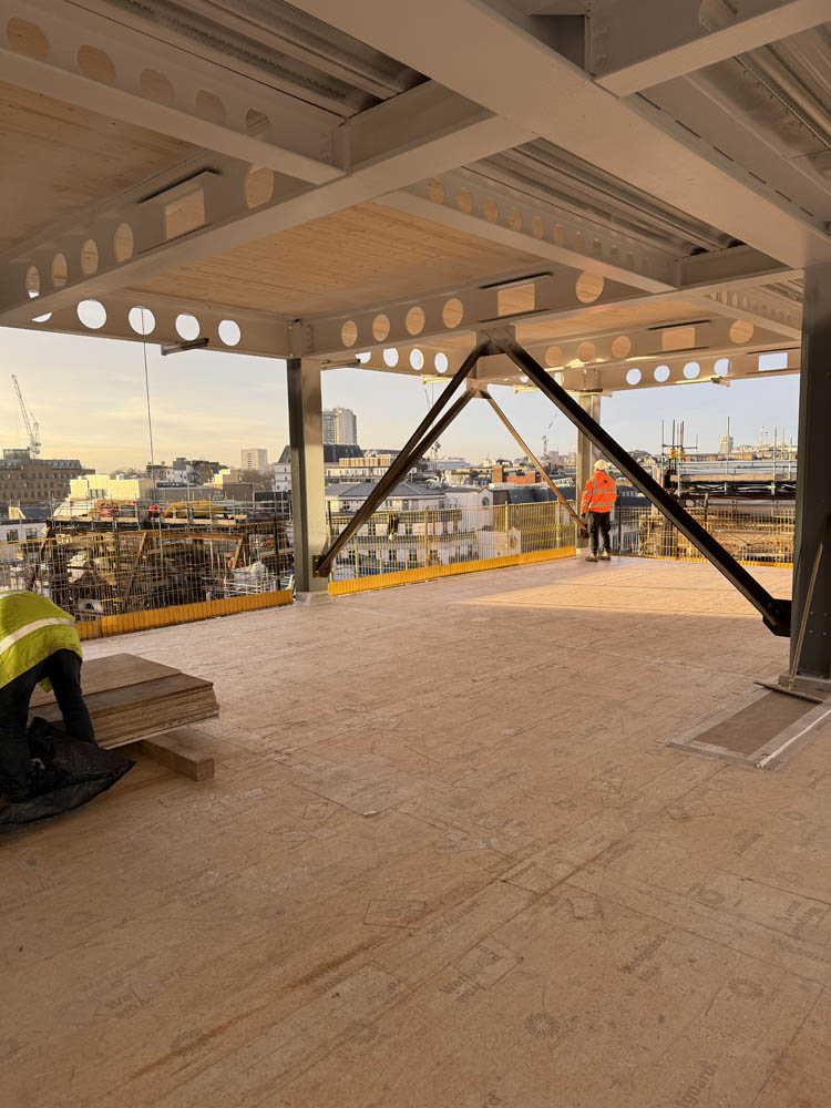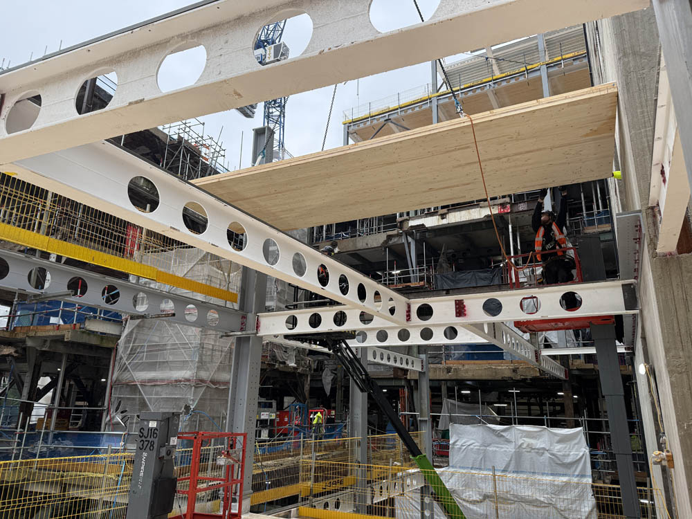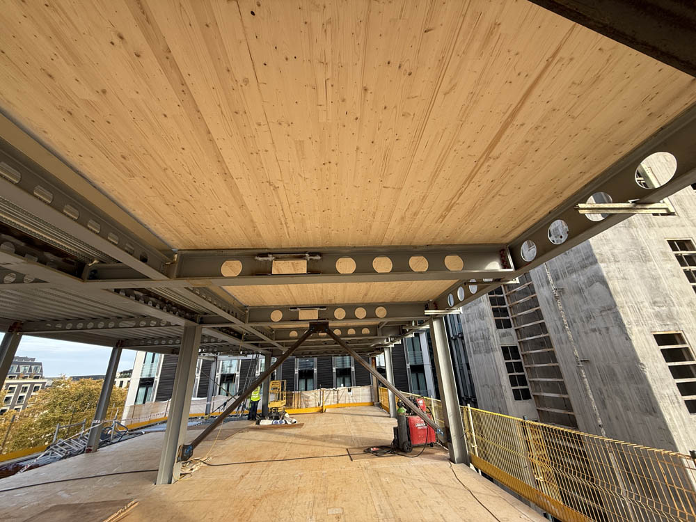 Landmark transformation of the former Fenwick store in London’s Mayfair which includes the addition of four floors above the existing structure and a nine storey building to the rear, both formed of a steel frame with CLT floor slabs. G-frame were responsible for the design, supply and installation of the CLT floors for both buildings. The scheme is targeting BREEAM ‘Outstanding’, WELL ‘Platinum’, LEED ‘Platinum’ and NABERS 5* ratings and once complete will house retail spaces on the ground and first floors, offices on the second to ninth floors and a rooftop garden on the tenth floor.