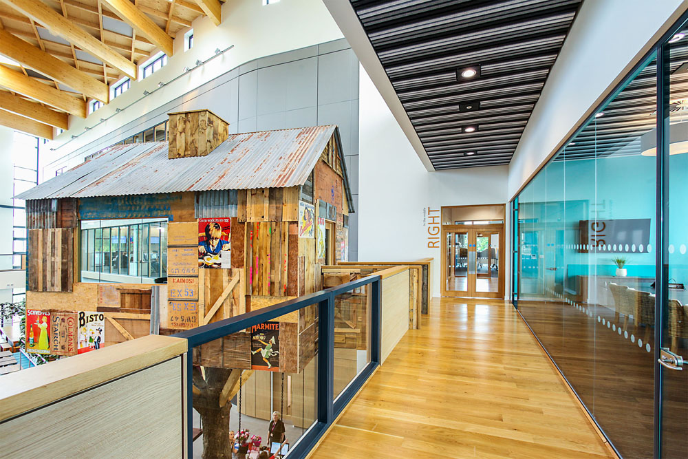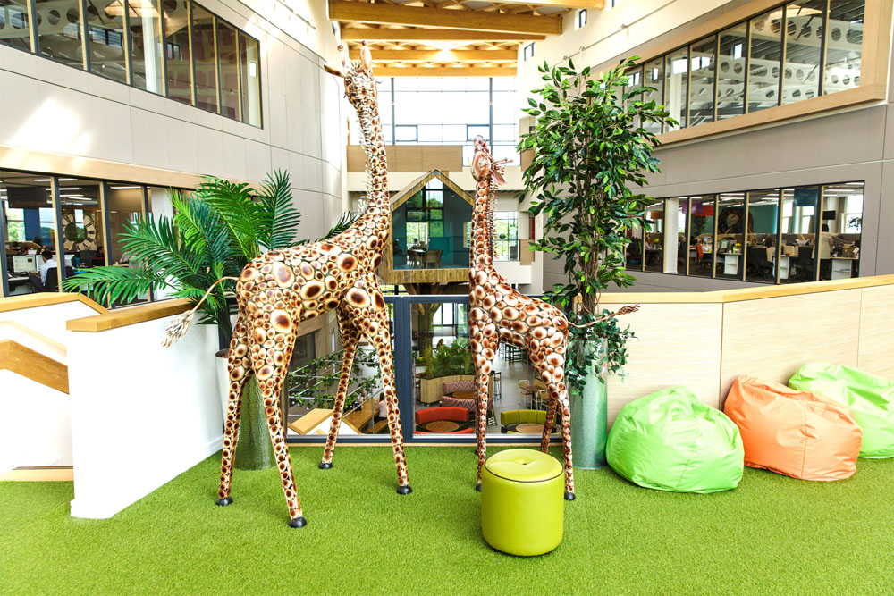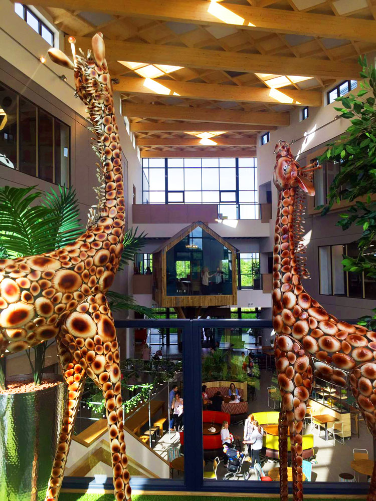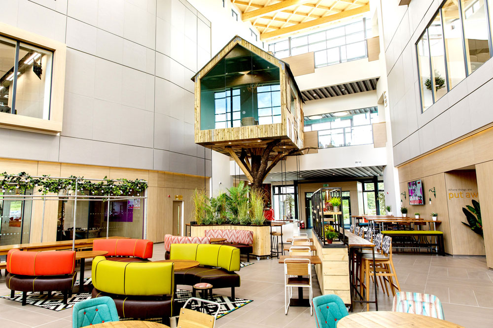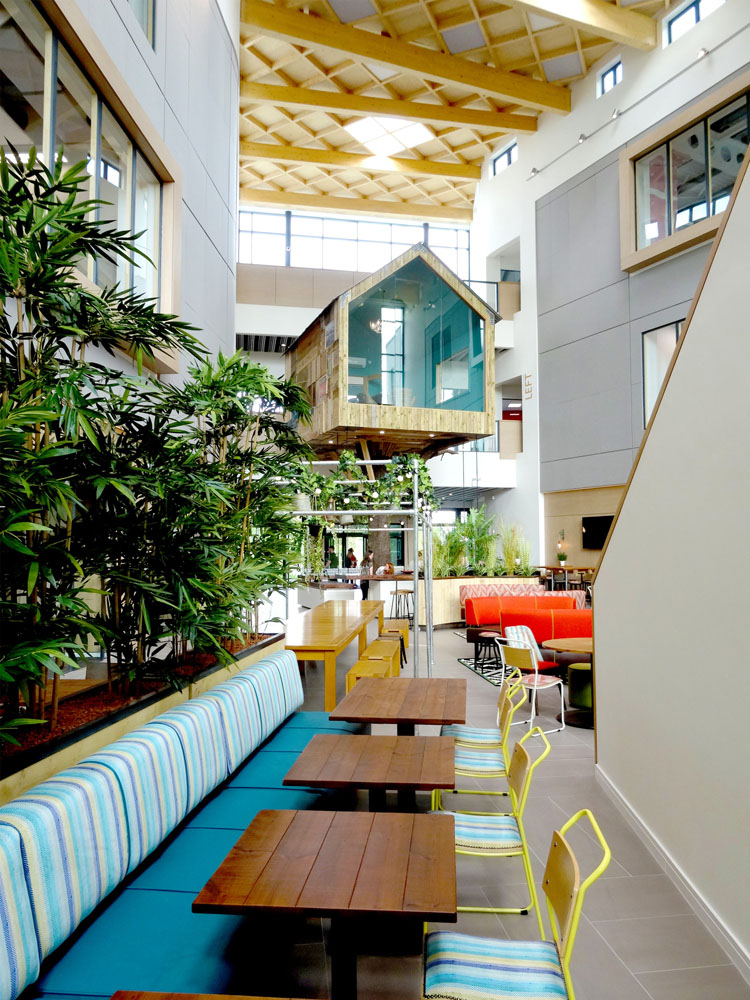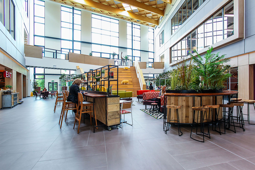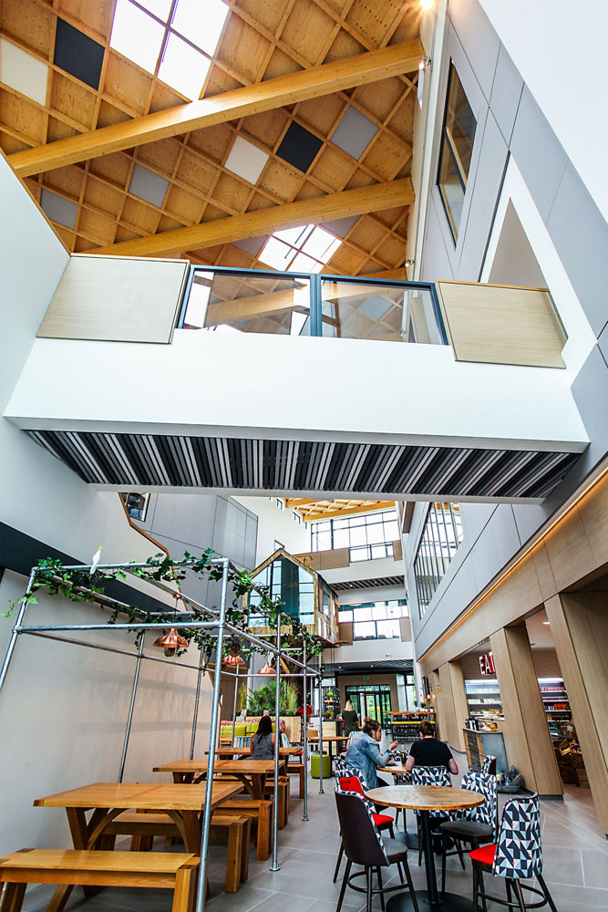 Multi-award winning office space for the UK’s leading telephone answering specialist Moneypenny. The new three storey development, located on a 10 acre greenfield site, provides 90,000 m2 of office space. A central triple height atrium featuring a waffle-effect glulam roof creates break out space, meeting areas and restaurant facilities for staff. The glulam beams and infill panels for the atrium roof, which run in-between two steel structures spanning 25 m, were supplied and installed by G-frame. The waffle-effect achieved by the roof helps to create a stunning focal point for the building. A tree house meeting room, village pub and bleacher seating complete the accommodation.