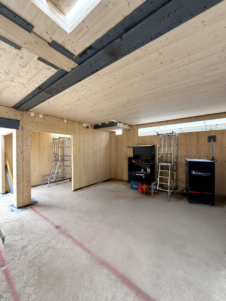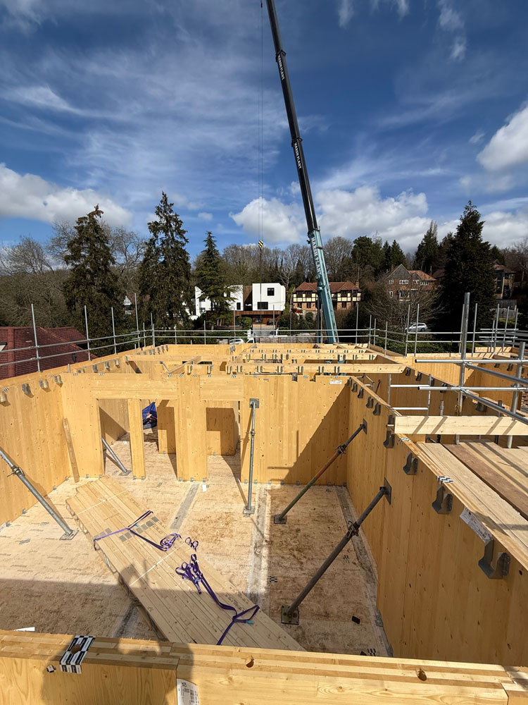 The G-frame team is currently on site in Hertfordshire installing the CLT and glulam superstructure for this contemporary five bedroom family home which is being built using CLT and glulam. Use of mass timber for the superstructure is part of an overall Passive House design approach which will help the project meet RIBA 2030 Climate Challenge standards.